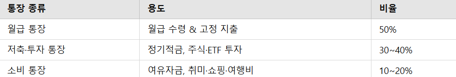 - 한 통장에서 월급, 생활비, 저축, 투자, 카드 대금까지 모두 처리