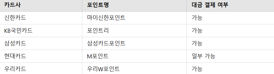 카드사별 대금 결제 가능 포인트