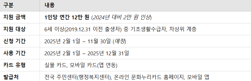 2025년도 문화누리카드 지원 내용 요약